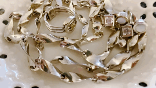 3. 세척할 은제품을 넣고 소금과 베이킹 소다가 녹을때까지 잘 저어준다.